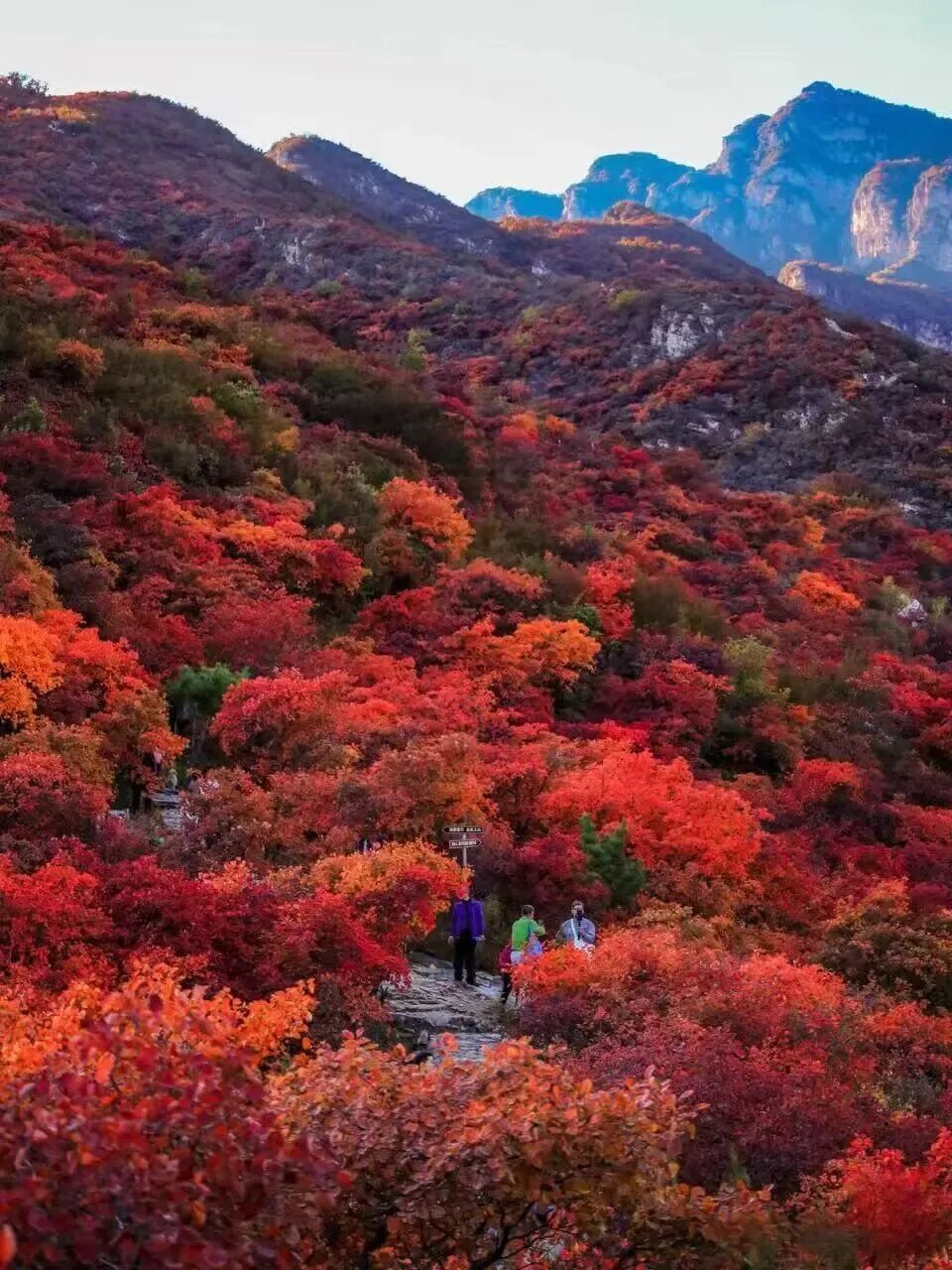 特色:坡峰岭以其2000亩核心观赏区和珍贵的百年黄栌而闻名。这里的红叶密集度堪称北方第一,从山峰到山谷,像一条红色的河,将整个山峰装点得如诗如画。此外,坡峰岭还举办红叶节,有山货集市、乡土美食等丰富活动。