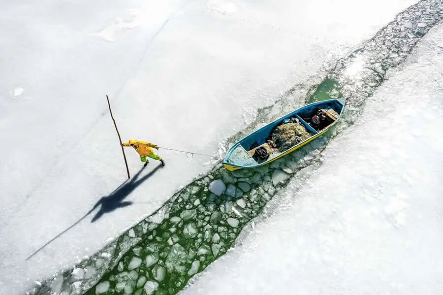 “冬季的贝伊谢希尔湖结冰后,渔民们用自制工具凿冰开路,继续捕鱼劳作。尽管这份工作十分艰辛,但捕鱼是他们的生计,因此他们能适应各种环境。”