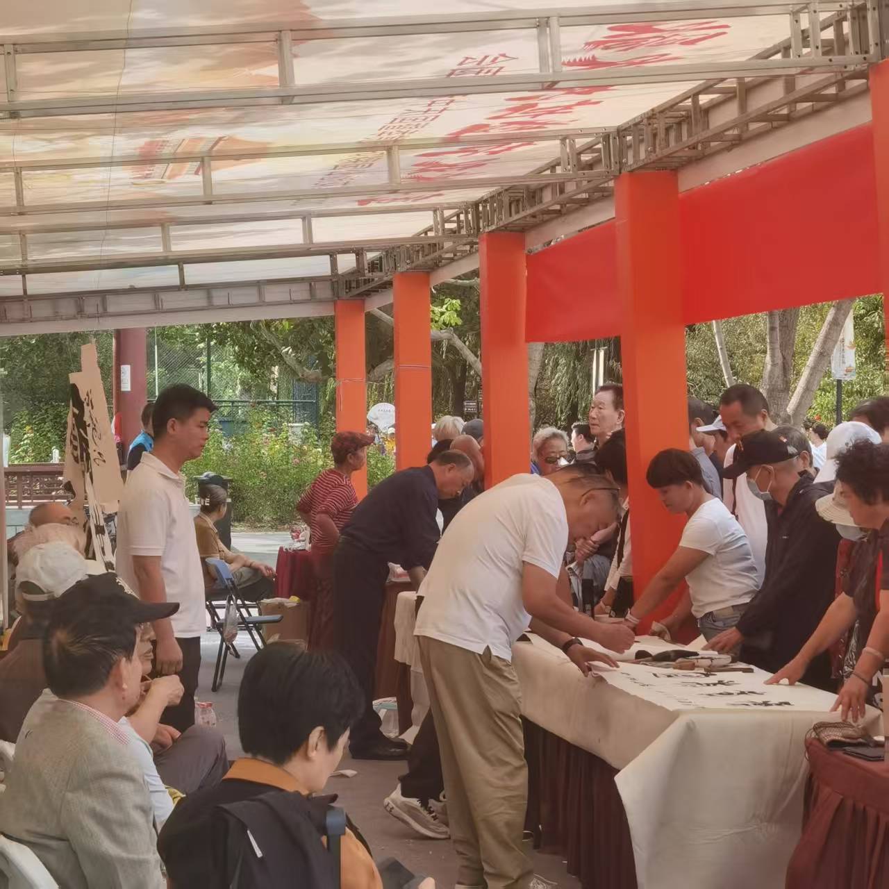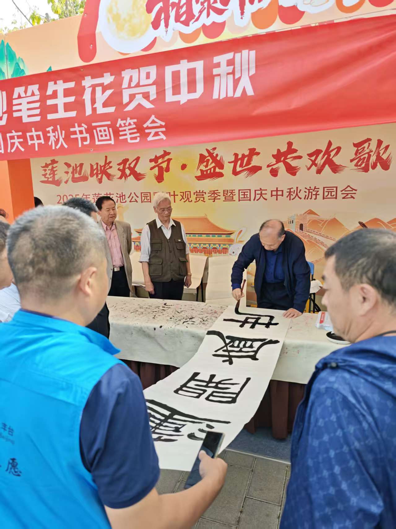 随后的书画笔会环节,各位艺术家齐聚一堂,现场挥毫泼墨,或书写家国情怀的诗词佳句,或描绘秋日莲池的秀丽风光,墨香四溢间,引得众多游客驻足围观、拍照留念,不少市民还主动与艺术家交流书法心得,现场互动氛围热烈。