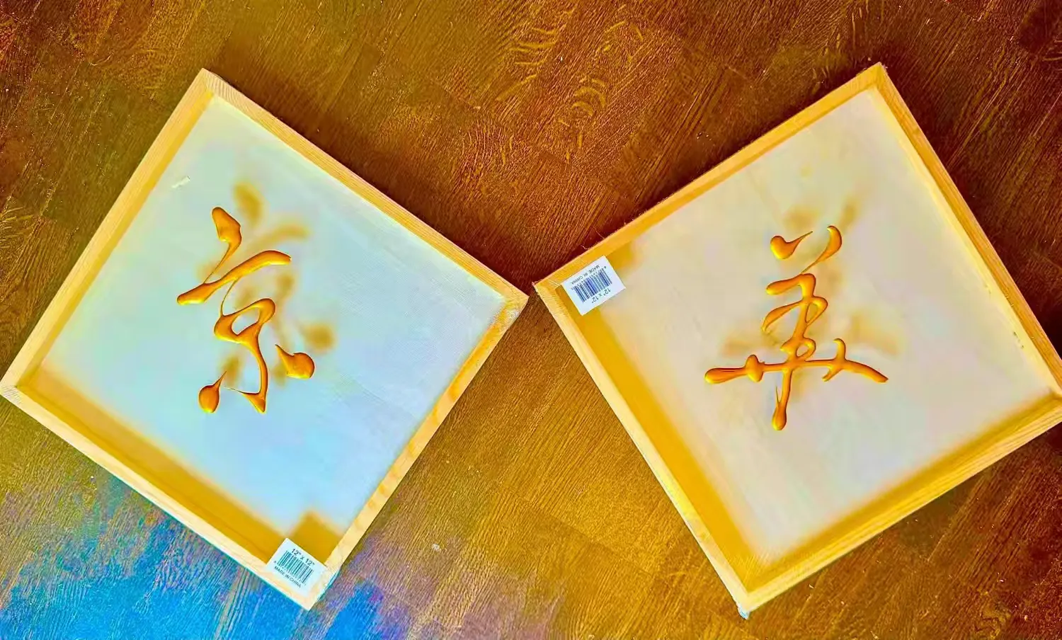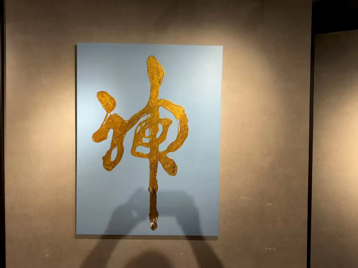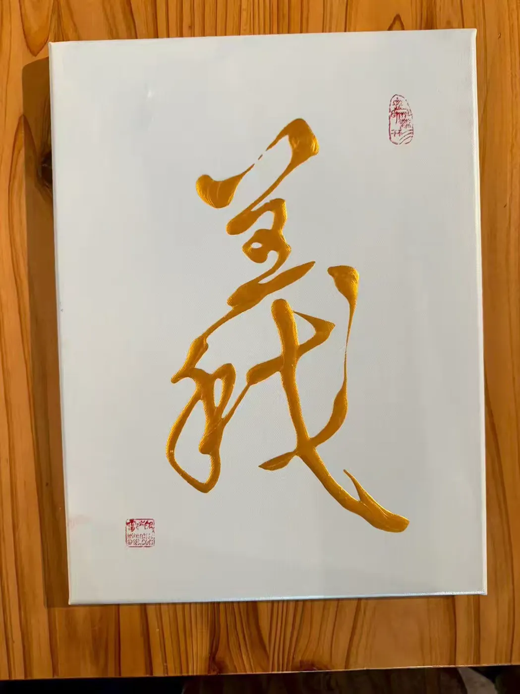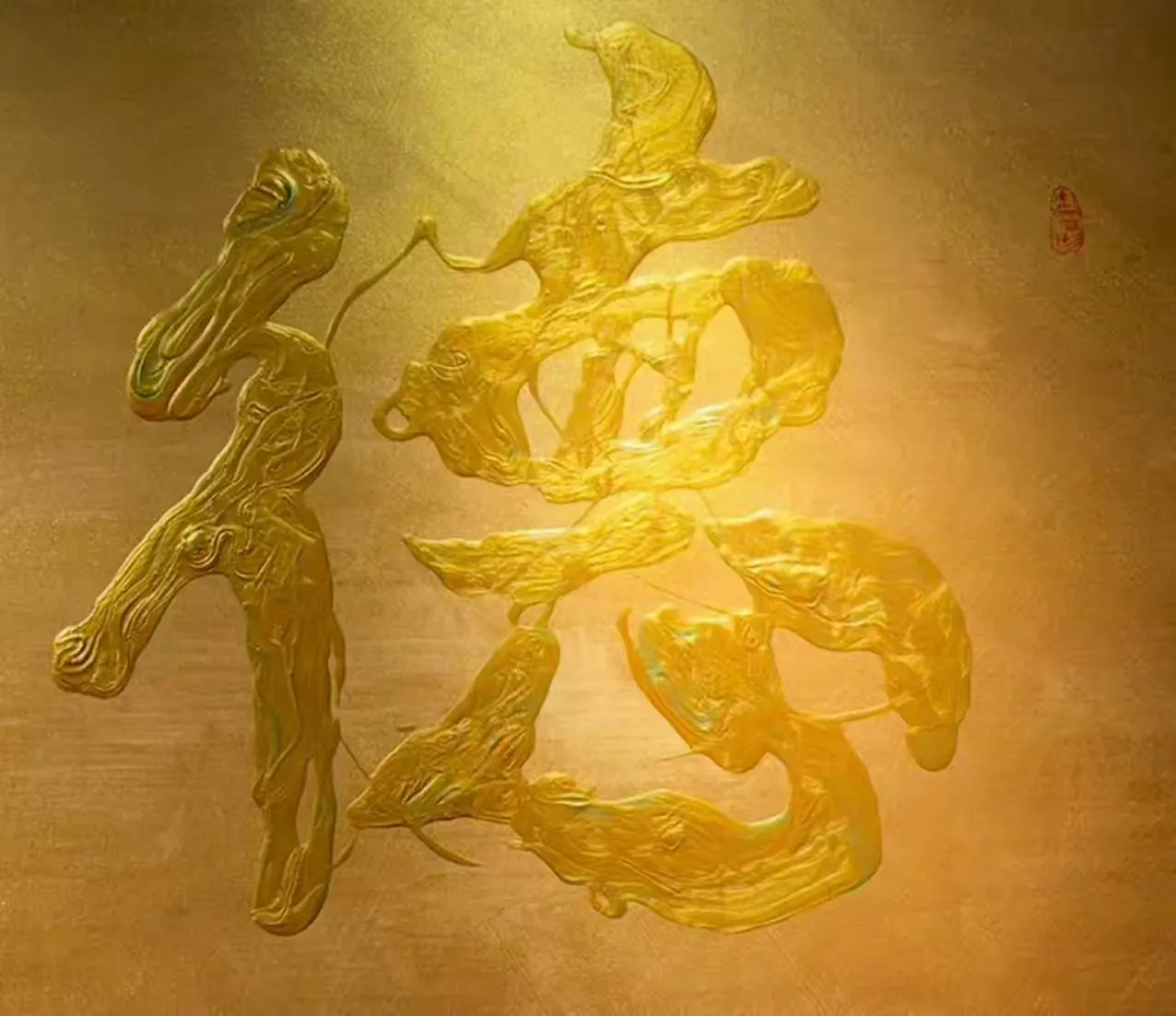 雷人创立的立体书法,旨在通过独特的书写技巧和材料运用,使书法作品在视觉上呈现出三维立体的效果。为了实现这一创作理念,雷人先生尝试使用不同承载材质,如帆布或者木画板,搭配不同的颜料(如丙烯)以及特殊的技法(溜和遛),创造出具有立体感的彩色书法作品。同时,还巧妙利用多彩、多层叠加、综合材料入画等技巧,实现书法作品的立体多元审美效果。例如其 “遛金” 榜书作品,不用任何传统书写工具书写或者画笔画具画成,而是采用独特技法 “遛” 成(故称 “遛金”),作品既保持了中国书法的基本元素,又充分利用 “遛” 的独特技法产生立体感,即浮雕的质感,“遛金” 过程的艺术加工,使其纹理所自然形成的艺术效果,也非手绘艺术所能表达。