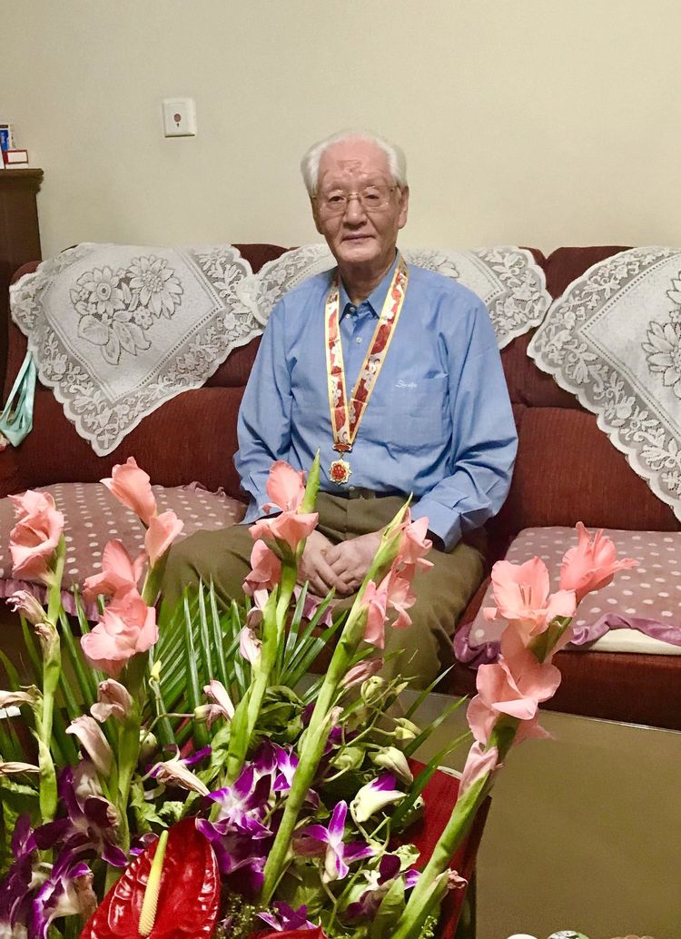 张宝章接受70年老党员的献花。