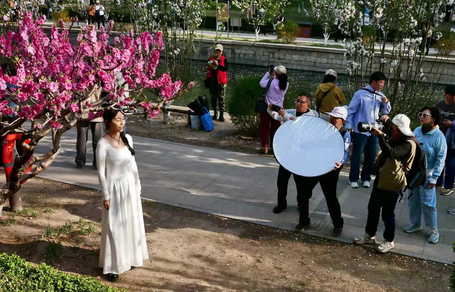 本次拍摄活动选址元大都城垣遗址公园海棠花溪,恰逢园区海棠进入最佳观赏期。经过2025年景观提升专项工程,园区海棠总量突破万株、品种达56种,4.8公里海棠景观带蜿蜒起伏,小月河两岸花影倒映,摇橹船穿行其间,与古韵景观、特色打卡点相映成趣,为摄影创作提供了绝佳的自然与人文背景。活动现场,协会会员们背着摄影器材,穿梭在海棠花海中,时而聚焦枝头盛放的海棠,捕捉花瓣纹理与光影交织的细腻瞬间;时而围绕模特调整角度,定格人像与花海相融的唯美画面,用镜头诠释生态之美与人文之韵的完美结合。