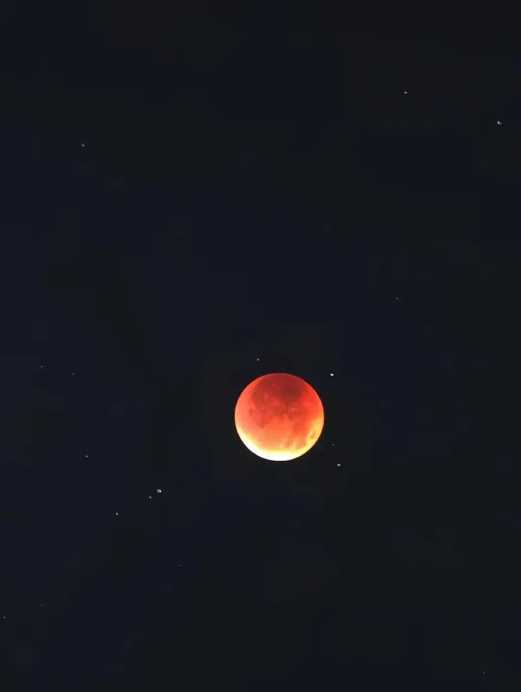 月海被染成凝固的朱砂,环形山的阴影如同神祇用炭笔勾勒的裂痕。这不是教科书里的月全食,而是一场跨越四十六亿年的宇宙祭祀。地球大气层将落日的余晖尽数滤出,把七重光色中的赤金提炼成一匹红绡,轻轻覆在月面上。我忽然想起《南齐书》里记载的 "月蚀如血,三日后王敬则举兵",那些被血月映红的史册页脚,此刻正与眼前的景象悄然重叠。崇祯自缢前夜的血色穹顶,君士坦丁堡陷落时的赤月高悬,都在这抹暗红中化作宇宙的回声。