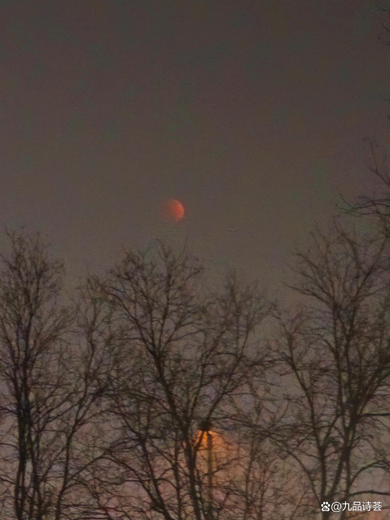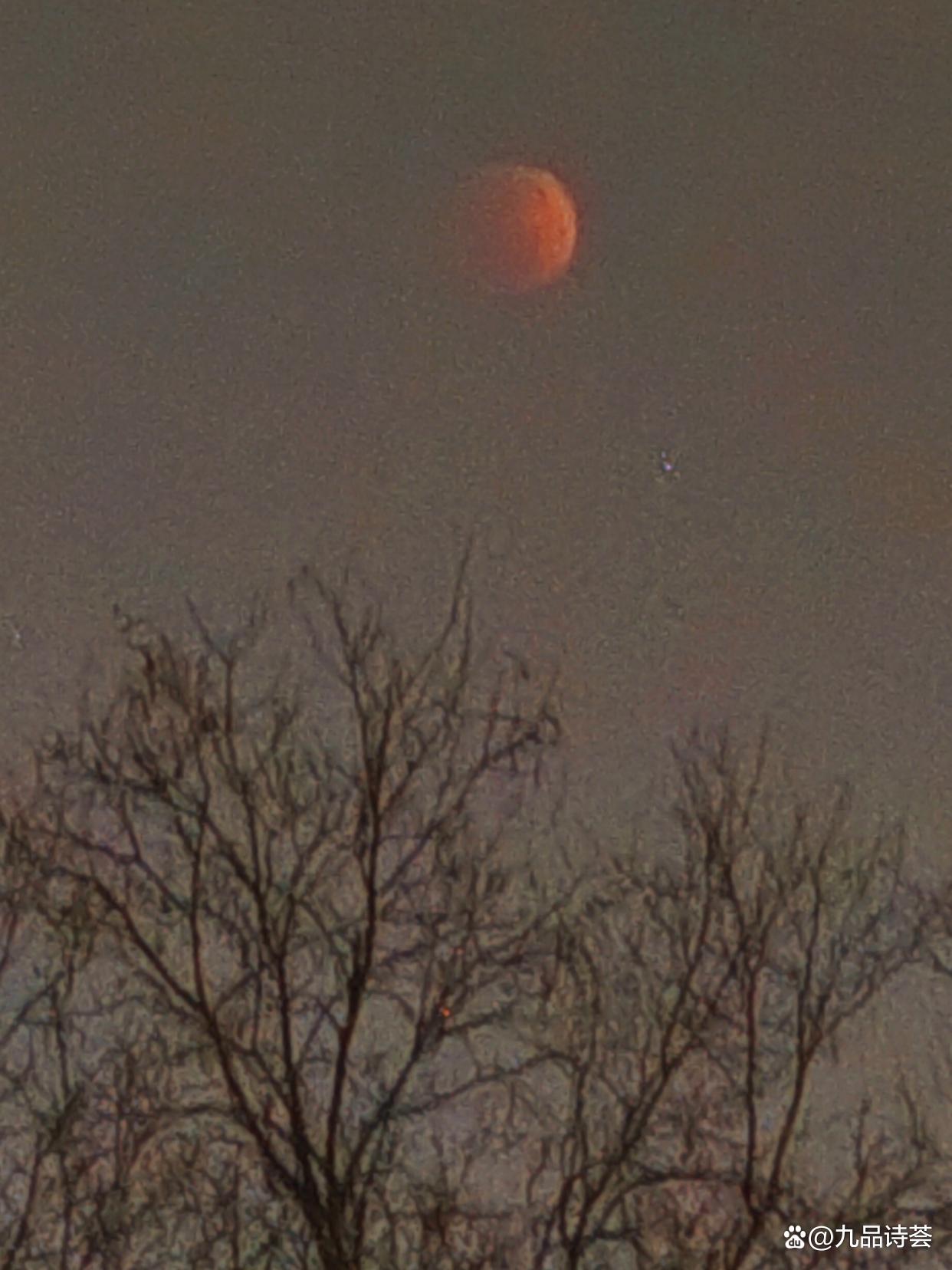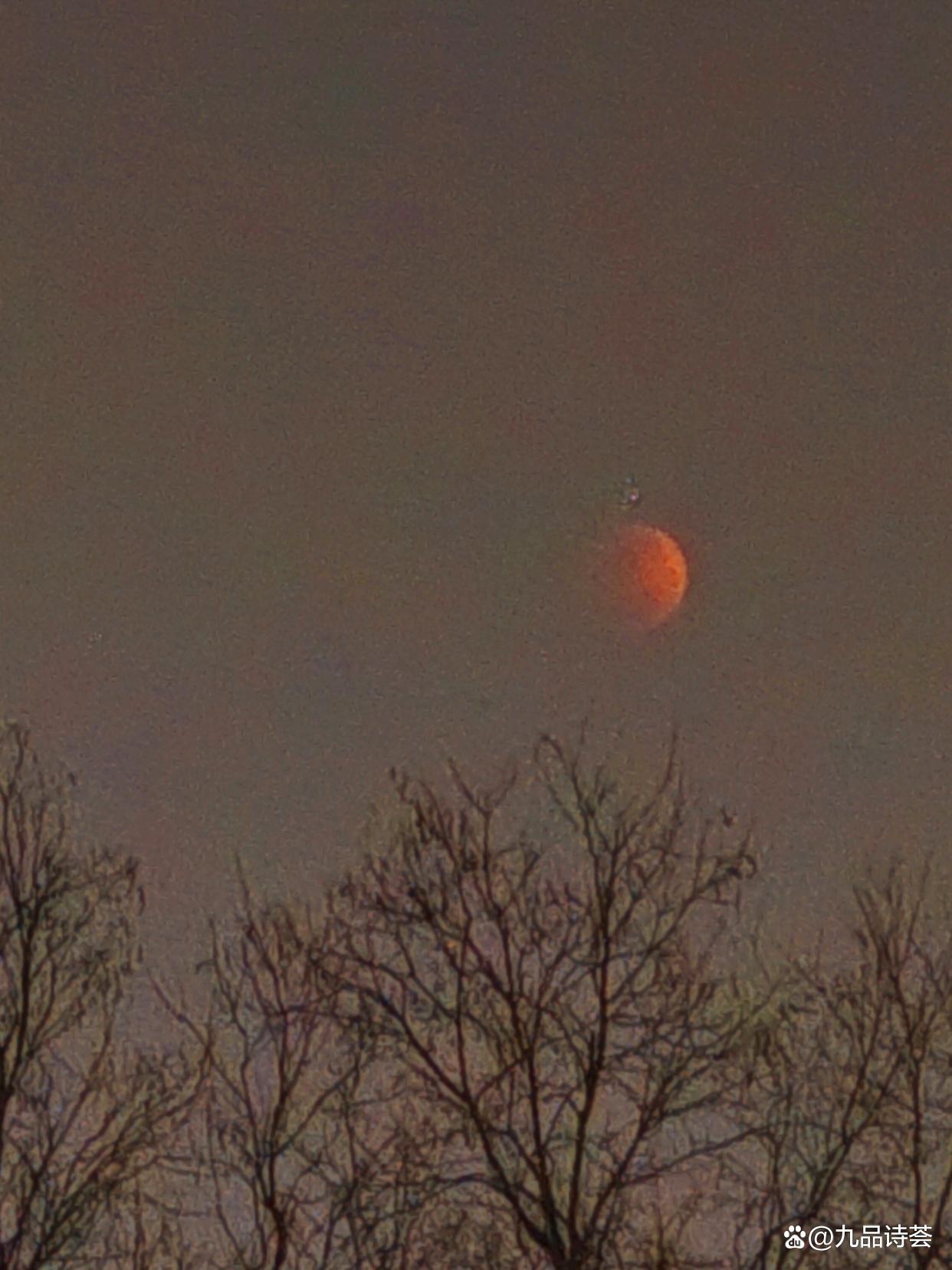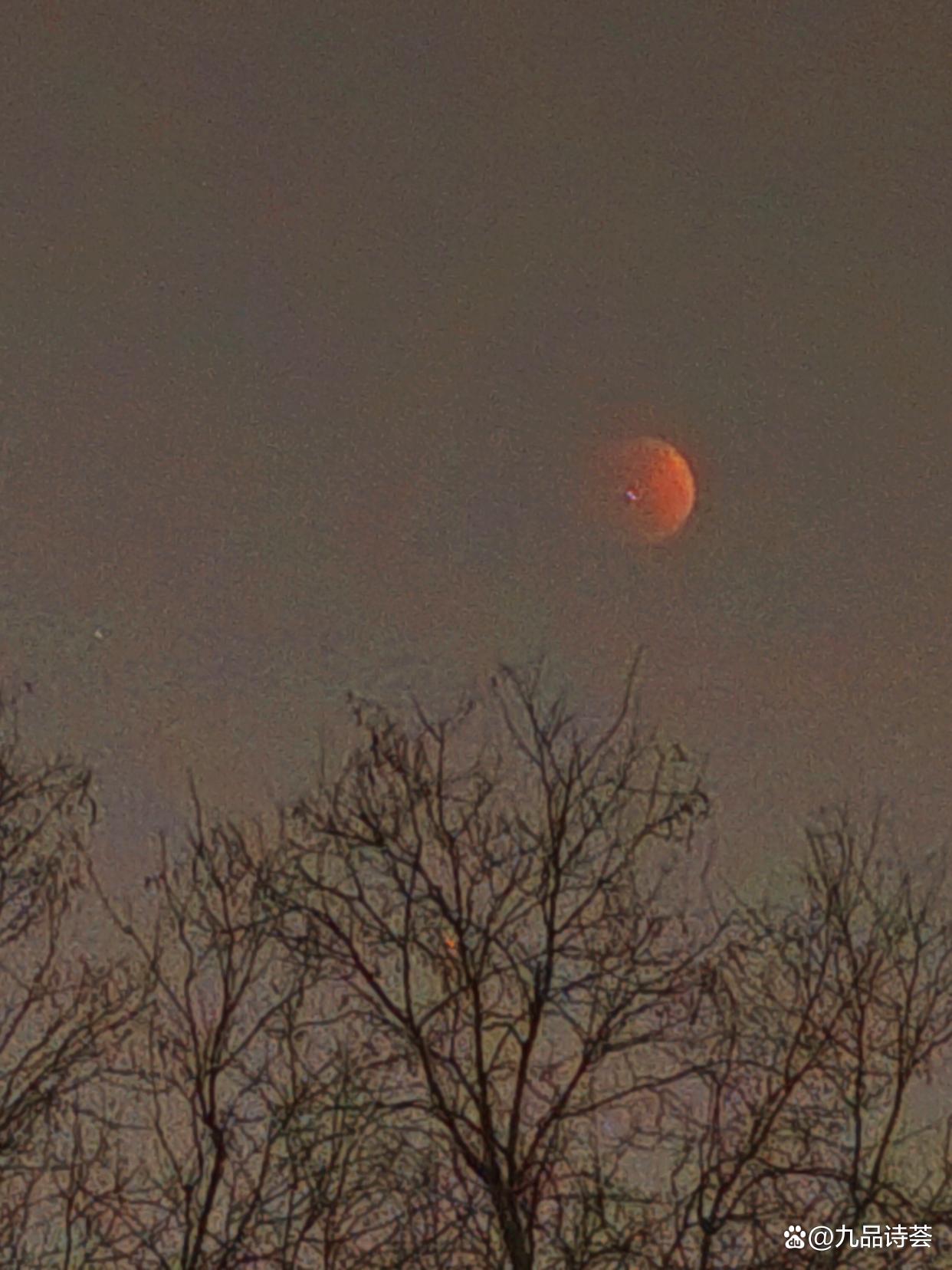 我站定了,喘着气,仰着脖子看。月亮只剩一小半亮着,像一枚银戒指的边。暗的那部分开始泛红,不是那种火红,是铁锈红,旧铜红,像什么东西在慢慢燃烧。