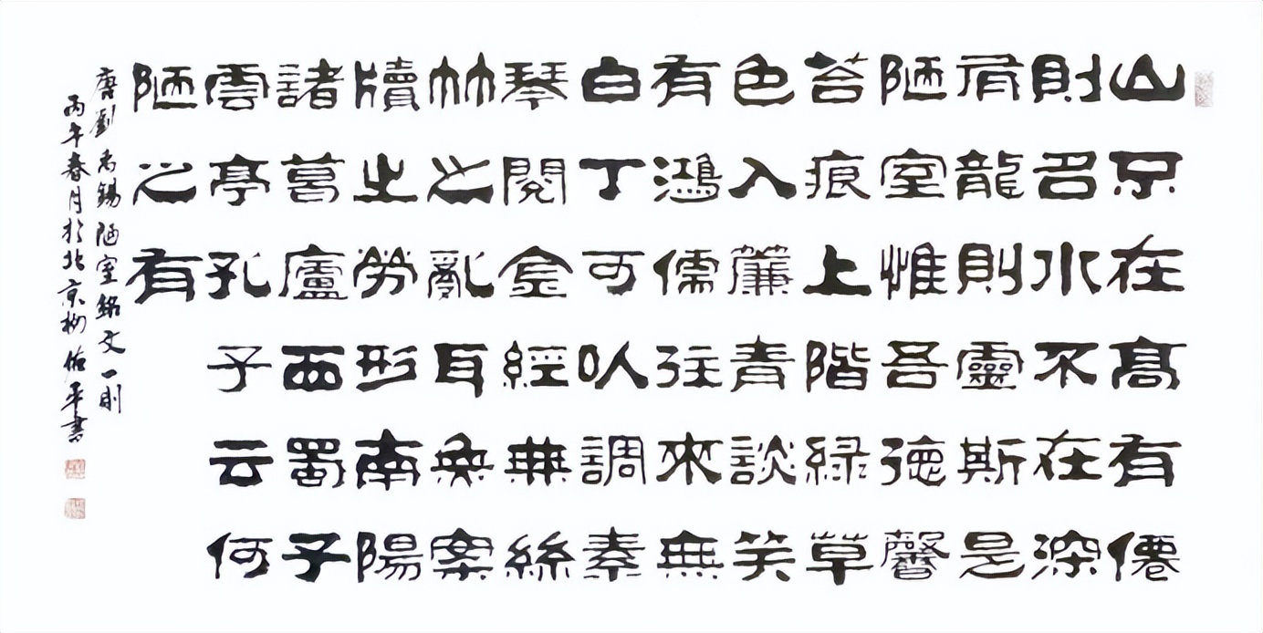 柳体“法度森严”,是唐代“尚法”书风的极致体现,清代王澍评其《玄秘塔碑》“如辕门列兵,森然环卫”②。对于学者而言,这既是最佳的入门阶梯,也可能成为束缚个性的沉重枷锁。柳佑平的超凡之处,在于他深刻理解了“法”与“意”、“传承”与“创新”之间的辩证关系。他并未停留在对祖辈形式的机械模仿上,而是上溯本源,博采众长,“学习古代书法名家的艺术精髓”,在深研汉隶(如《张迁碑》《曹全碑》)及诸家法帖的基础上,寻求突破。